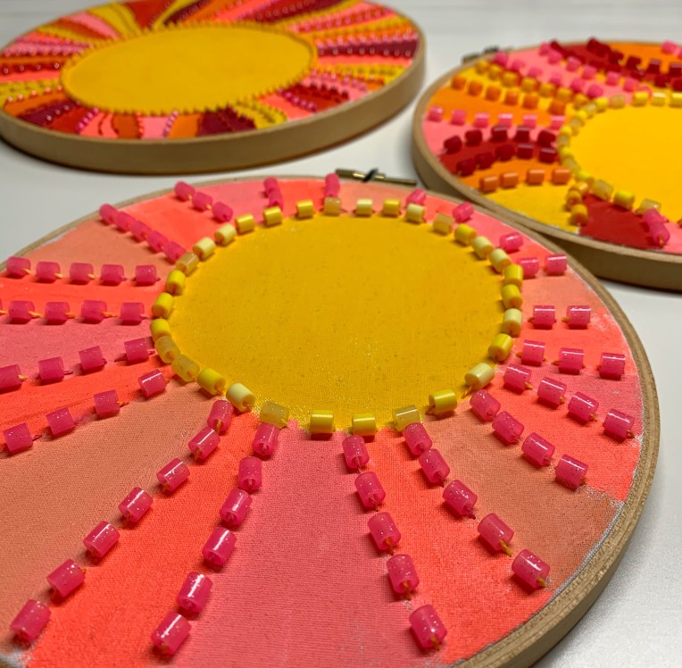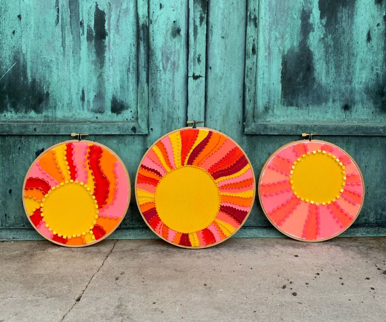 If you are not child-sized, I think it is still a fun project to take on…especially if you are new to mixed-media embroidery. I created my own version of this hoop and working with a sunshine-filled color palette was just what I needed during several rainy & cloudy days.