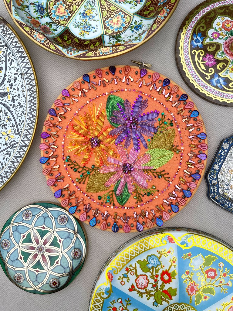 Whenever I stumble on a new (old!) floral tin, the intricacy of the designs always catch my eye and I wanted to replicate that same design inspiration in a new floral project. I was also challenged to use beads of different shapes, such as the Link and Pip beads, both of which I loved adding to the border.