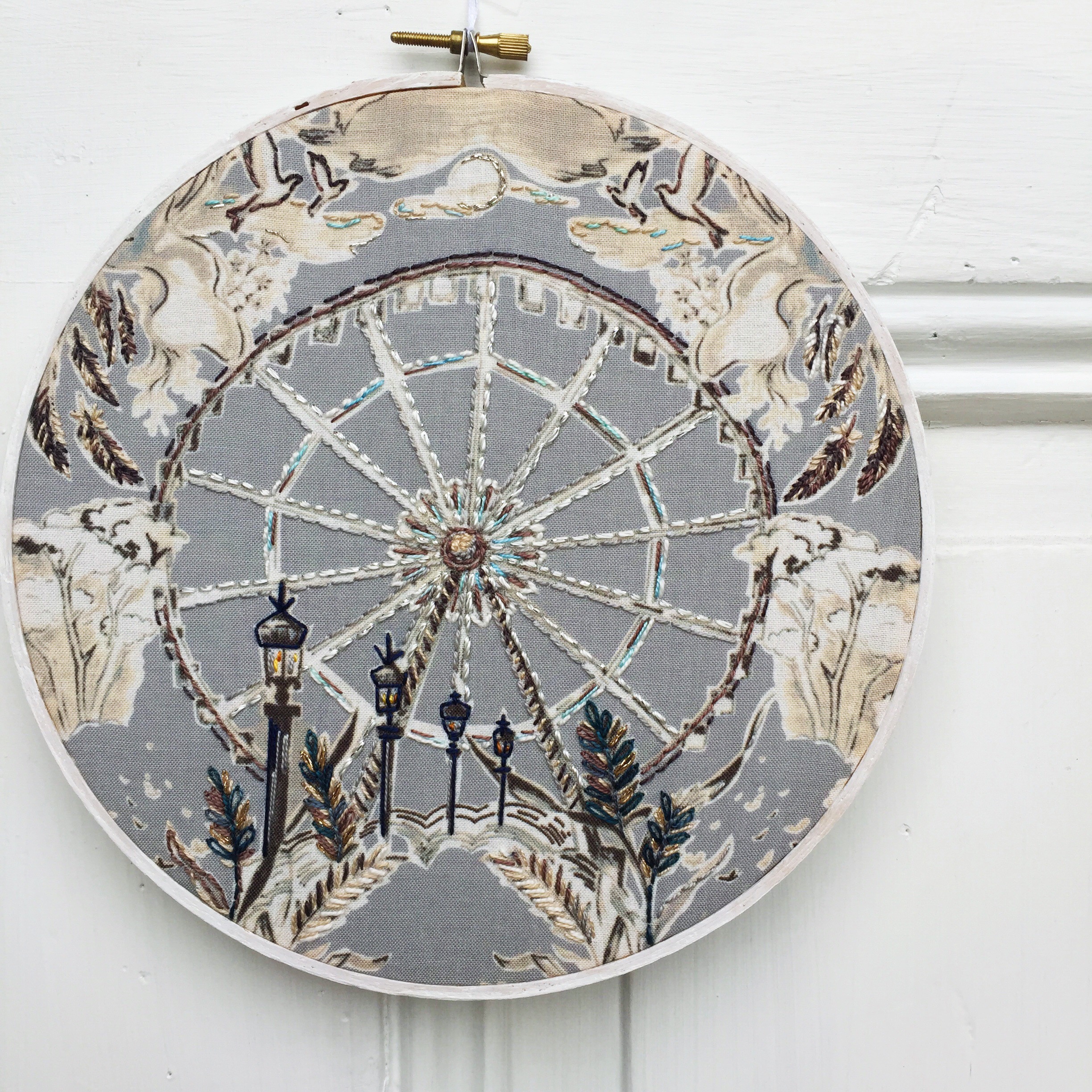 I could have added additional colors to these fabrics when I began to stitch them, but I decided to stay true to the color palette of the fabrics and chose to stitch in colors of silver, grey, black, white, pale blue, and even flecks of copper and metallic. I love that Jennifer hand drew these designs in charcoal, pencil, chalk and pen and I think the simple stitches highlight her designs.