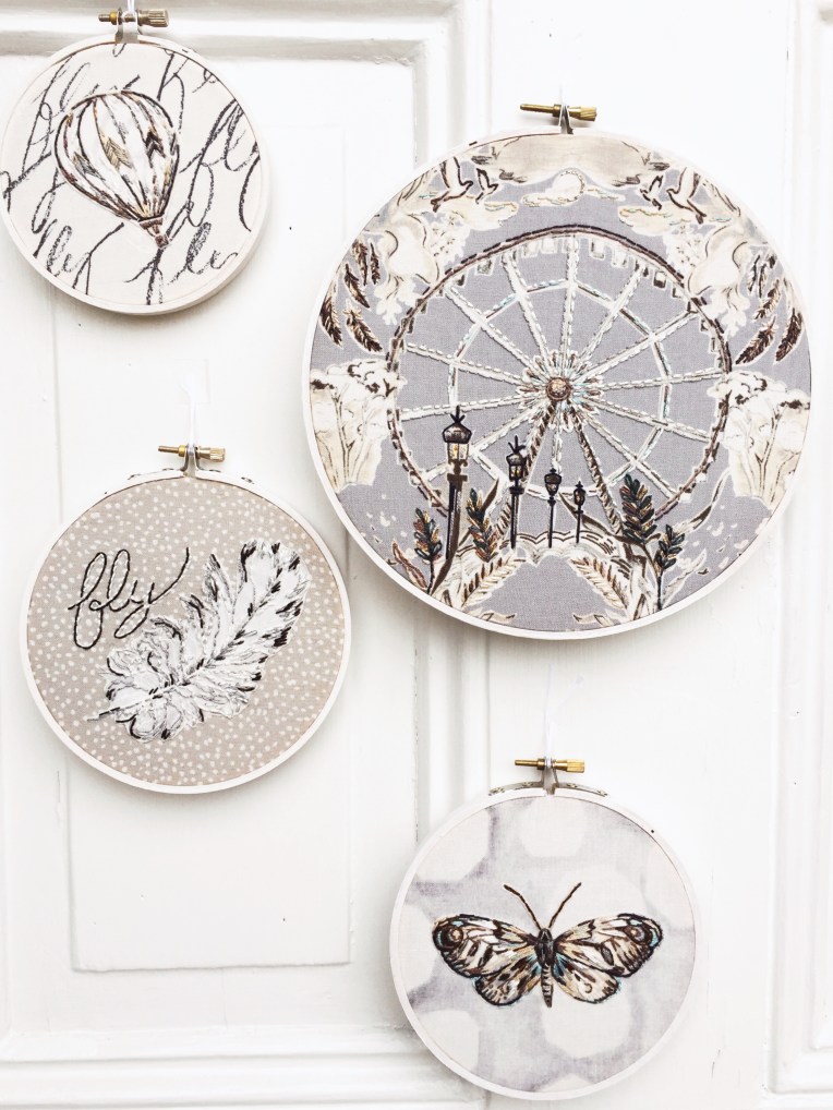 A long, long time ago….well, back in September, Jennifer Sampou sent me a gorgeous selection of her brand-new, not-yet-released, fabric-line-from-Robert-Kaufman, Black & White 2. I was so excited to have the chance to play with these muted palette fabrics…a departure from my typical saturated in color hoops!