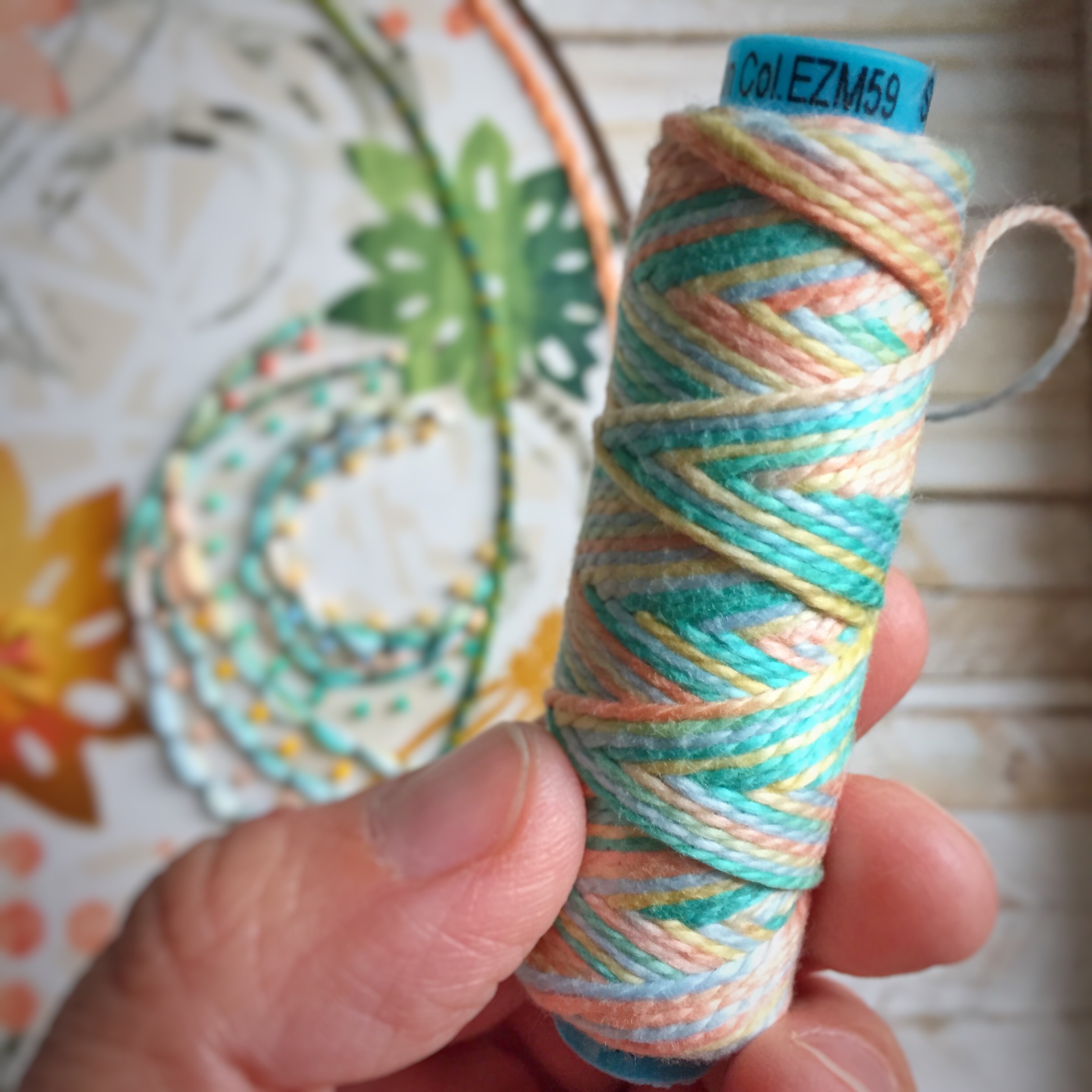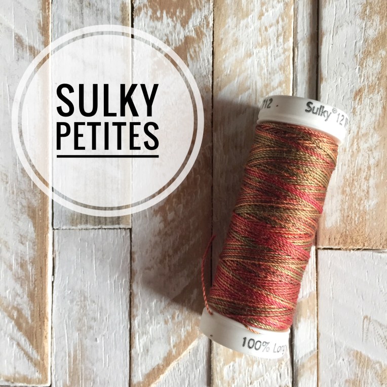 Another one of my favorite threads (especially to use when working with beads and sequins) is Sulky Petites. These threads are approximately the weight of 2-strands of a floss like DMC that gets separated, except you can use these right off the spool without separating strands.