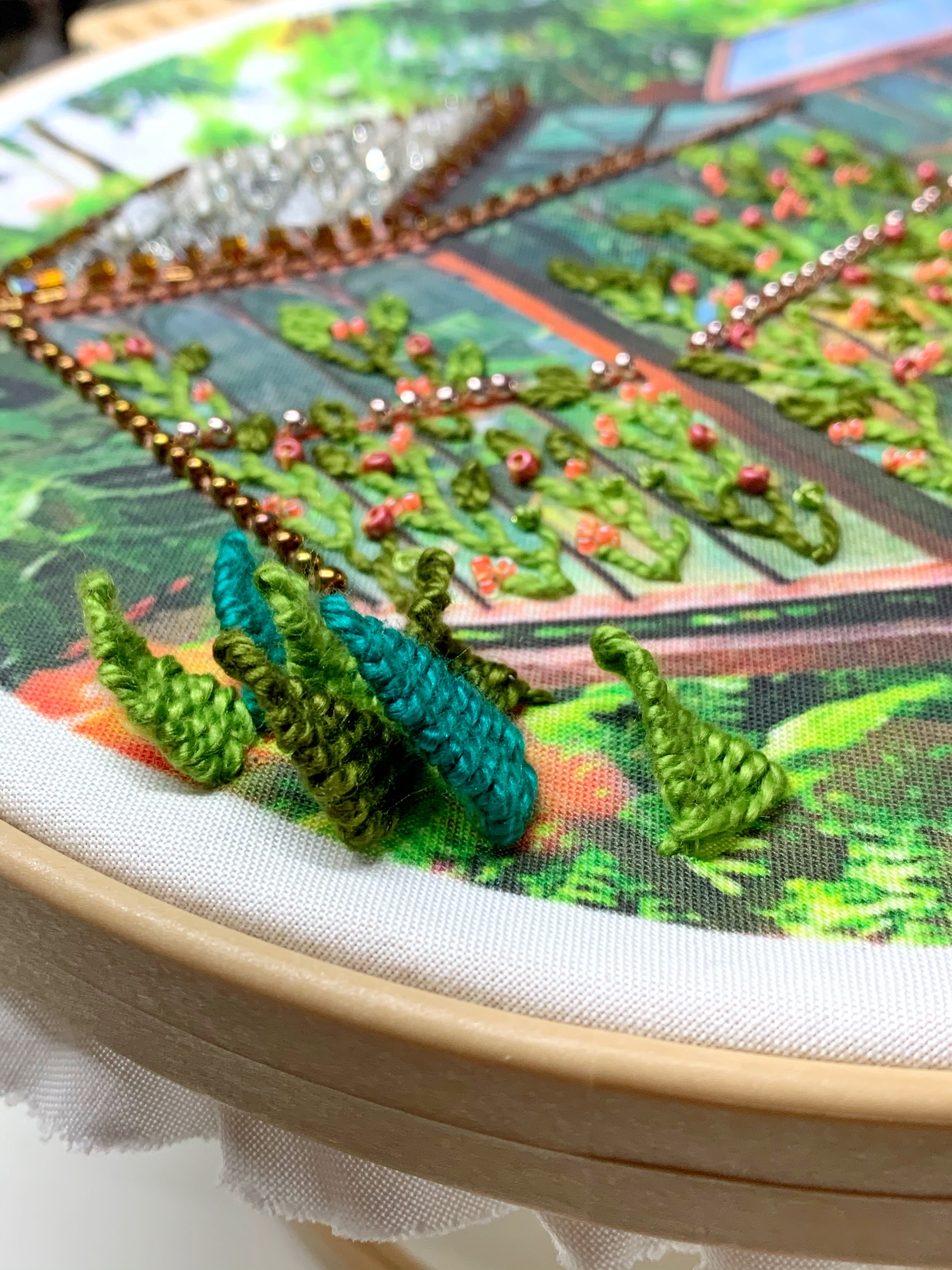 Once I had the large buttons in place, I began adding beads and sequins. Large beads first and the smallest beads last (the smallest beads help to fill in any areas that have white peeking through.