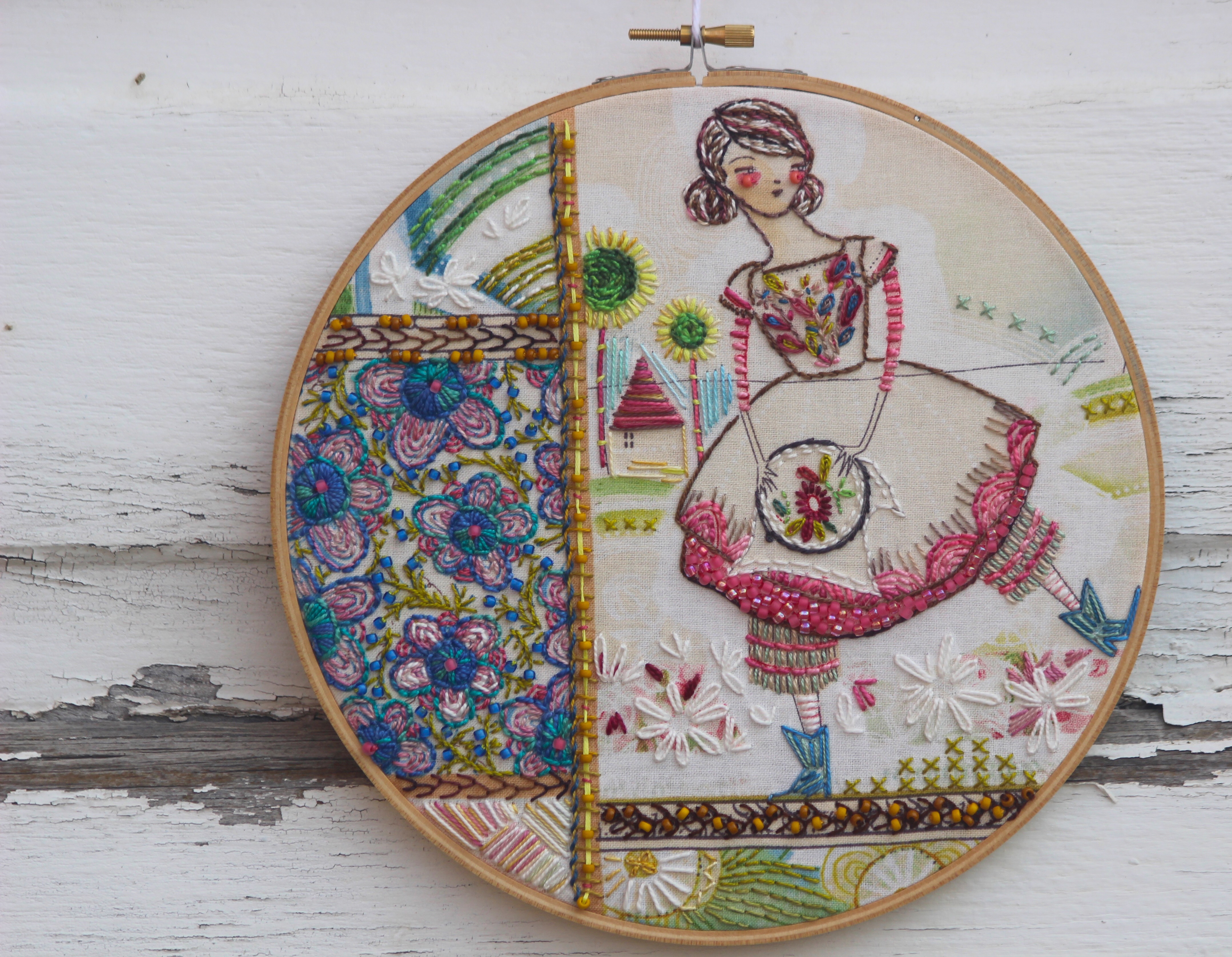I get asked all the time which hoop is my favorite and I think i’ve finally settled on this one! Made from The Ghastlies fabric by Alexander Henry, I think this snarky little lady puts into facial appearances the side of us that we all try to hide!!! Especially if someone uses our fabric scissors to cut paper!