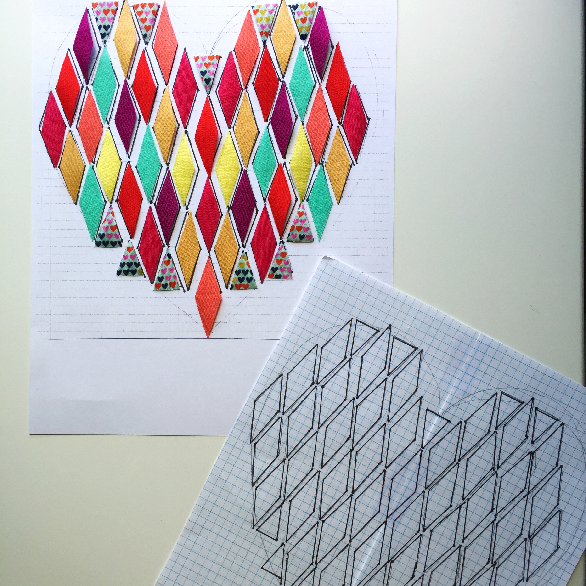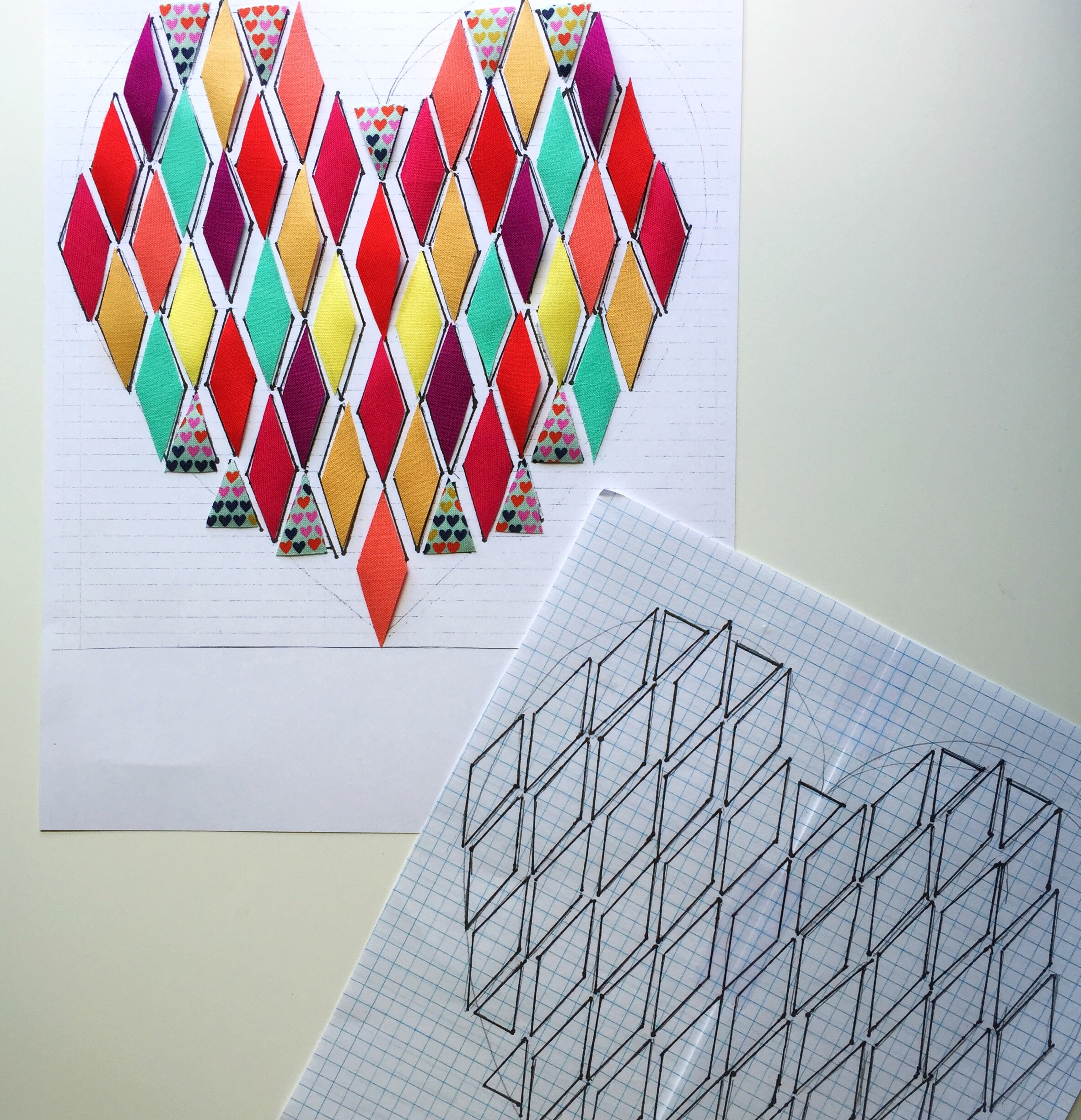 Several weeks ago, I was asked by RJR Fabrics if I would like to participate in the #whatshaderu blog hop for their Cotton Supreme Solids. I was excited but also realized this would be a challenge as I normally choose to work with patterned fabric over solids. A huge fan of Cotton and Steel, which is a division of RJR Fabrics (as you see noted on every keep-worthy bit of selvage!), I decided to choose 12 colors that would stand out on an assortment of grey Cotton and Steel Basics. I also knew that my design would be Scandinavian-inspired, just because. I drew up a pattern for a straight row of brightly colored houses, a funky floral design and, as pictured below, a geometric heart made of 54 diamond and half-diamond pieces. Time consuming? Absolutely! But well worth the effort to have solids like red, coral, pink and purple playing nicely together!