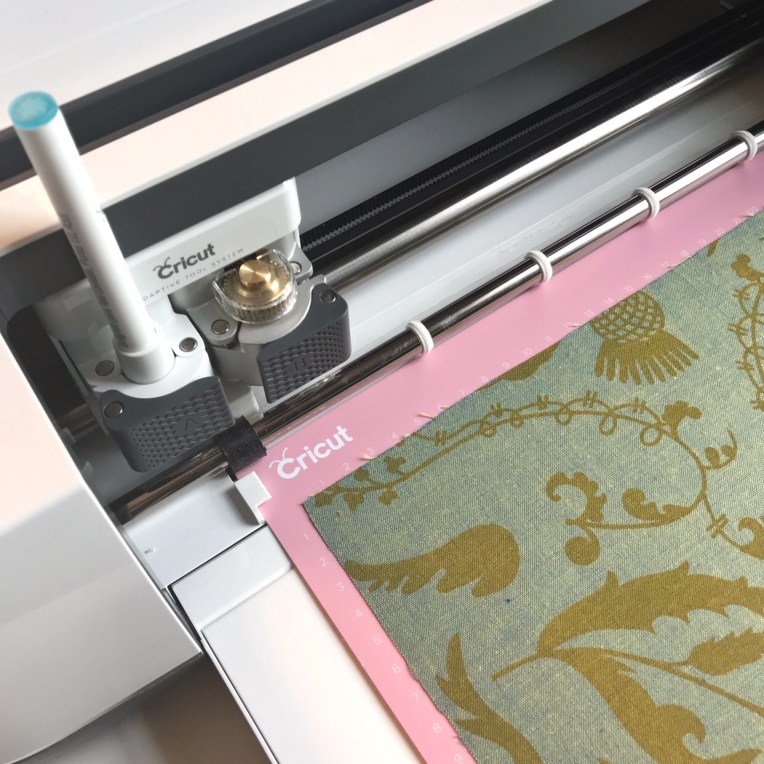The rotary blade and washable pen are in position and my fabric is ready to be cut!