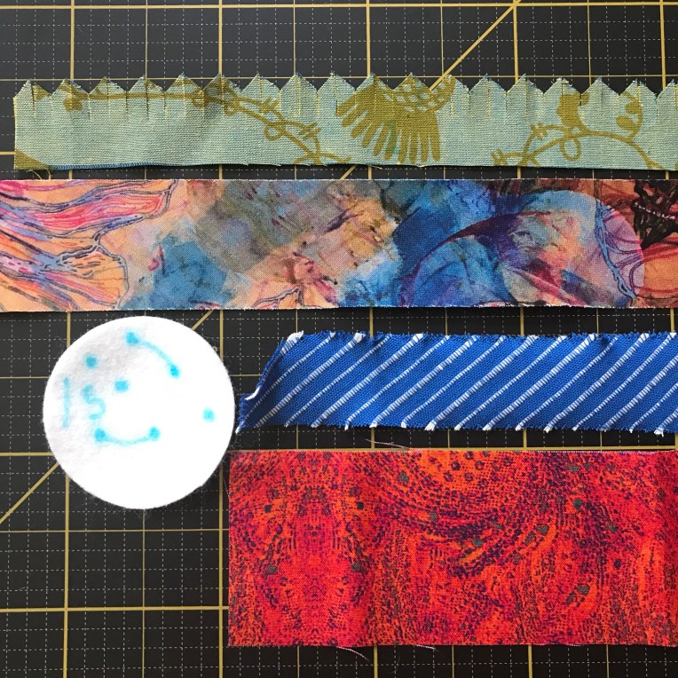 One suggestion after working through this pattern a few times: when you get to the two round circle pieces, choose a heavier fabric. My first choice was a thinner batik piece of fabric. My second choice was a heavier piece of textured cotton fabric. Finally on my third time cutting the pieces for the pattern, I decided to use a scrap of wool felt and that was definitely the best choice. The other fabric pieces worked fine, but because this is the piece that you are hand sewing everything on to, you want something fairly sturdy.