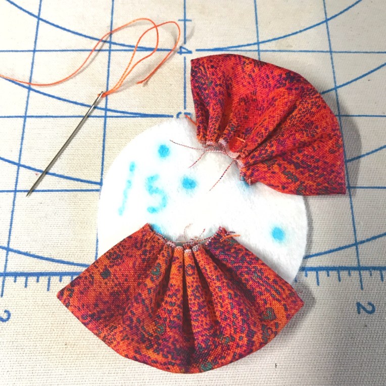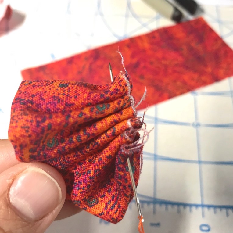Tie a knot and then pull your thread right so that the fabric gathers up nice and makes a little ruffle.