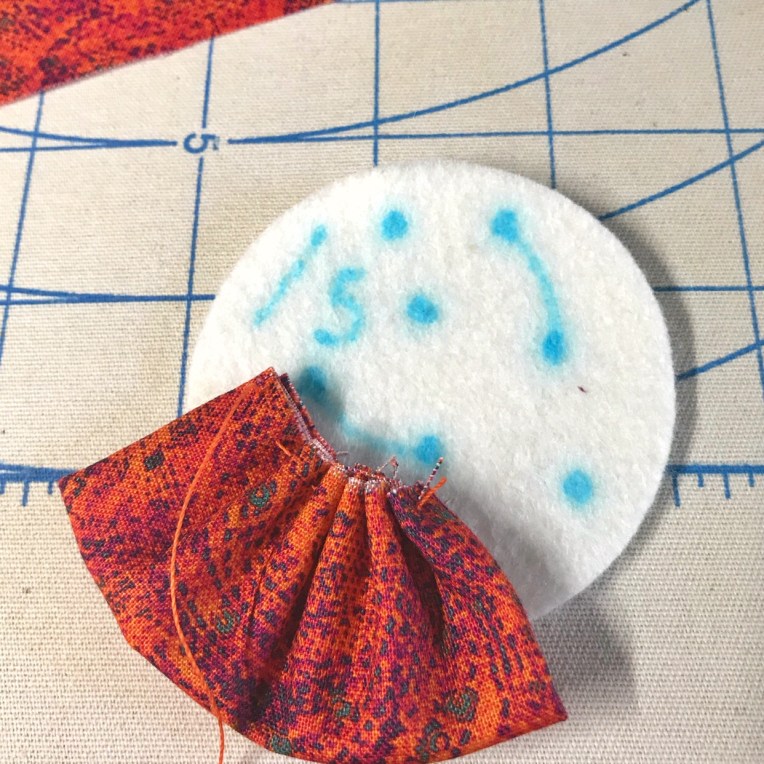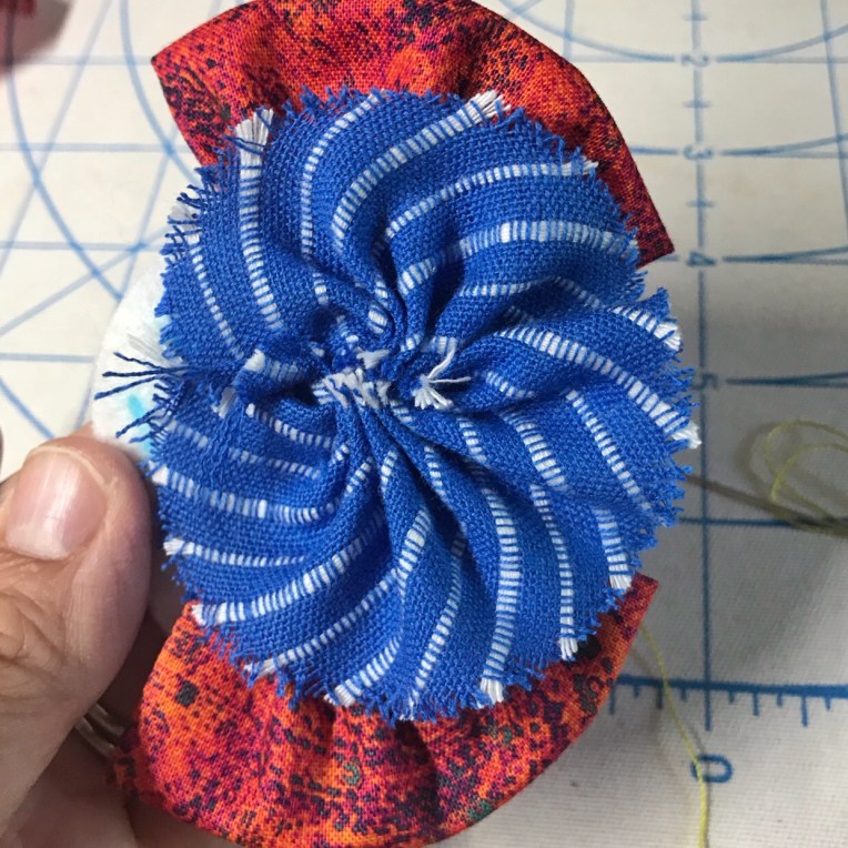Continue with each piece of fabric, following the directions as to where to attach it to the disc.
