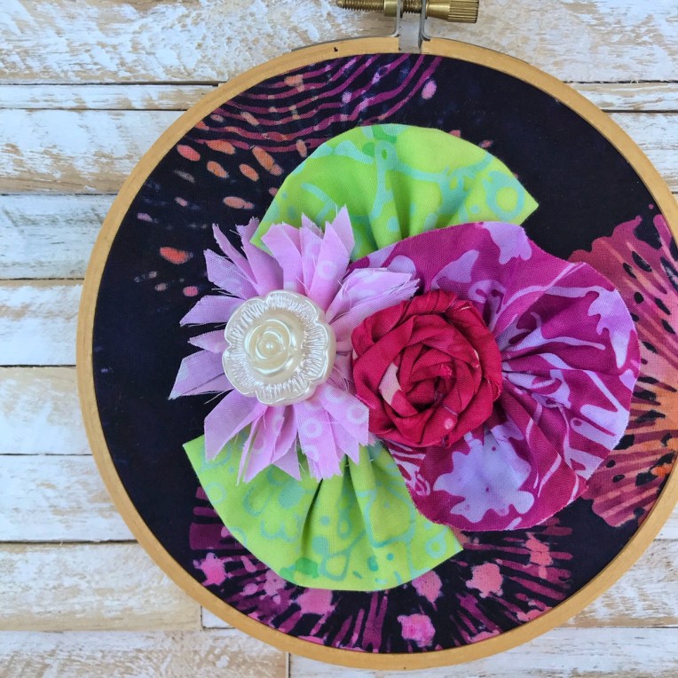 Here is my simple version of the flower and arrangement attached to a fabric that has been stretched in a hoop.